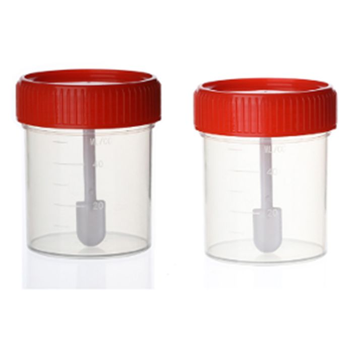 Frascos estériles de 25 ml con paleta incorporada, diseñados para la recolección y transporte seguro de muestras fecales. Ideales para laboratorios, clínicas y centros de análisis médicos.